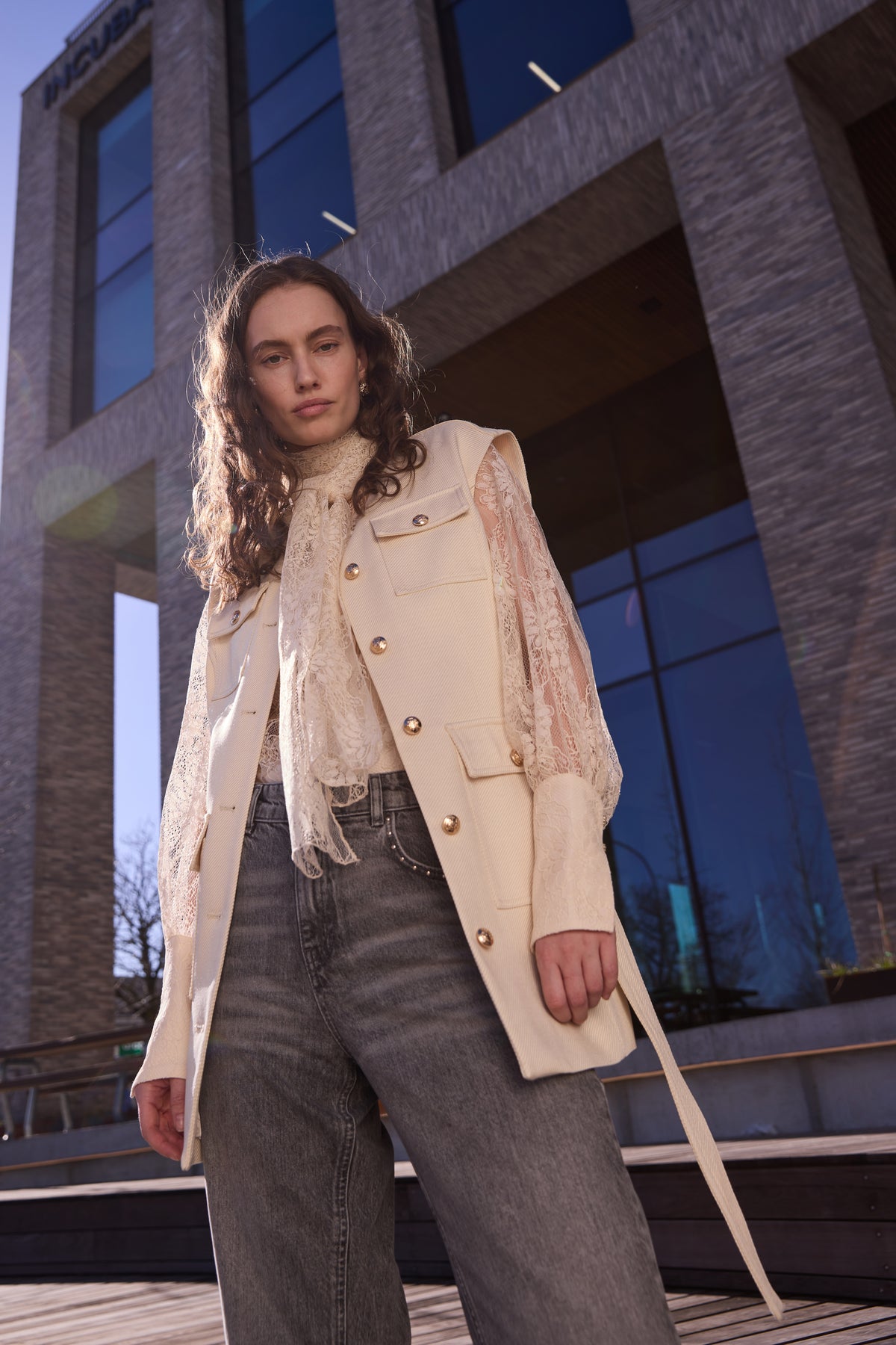 The CalcareaBBThelmas vest is a stylish and versatile piece with a flattering waistline and removable tie belt that accentuates the figure. With its decorative pockets and golden buttons, it combines military-inspired details with a feminine cut.