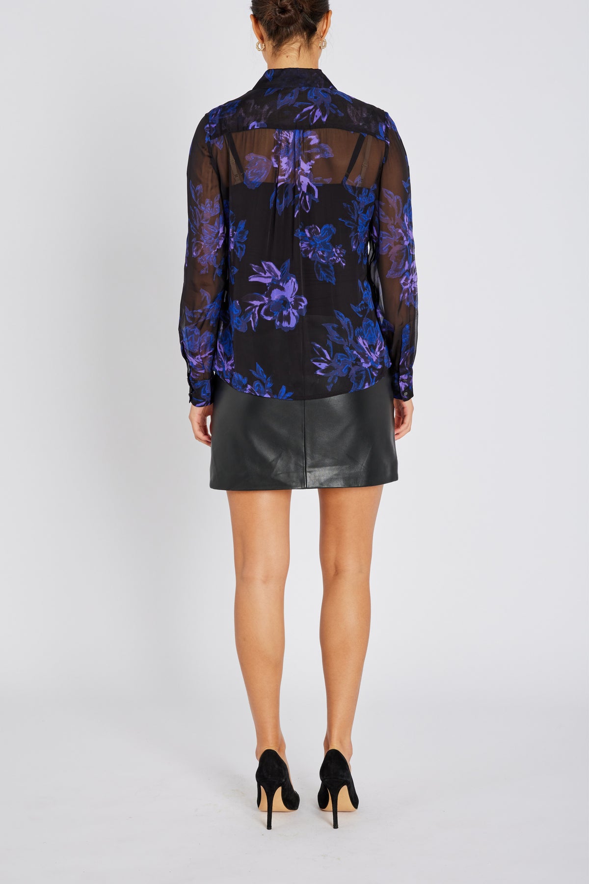 TrilobaBBCori shirt is a light and elegant sheer piece with a floral print in deep purple and blue tones. A classic collar and long cuffed sleeves create a sophisticated expression. Perfect for both office and evening wear.