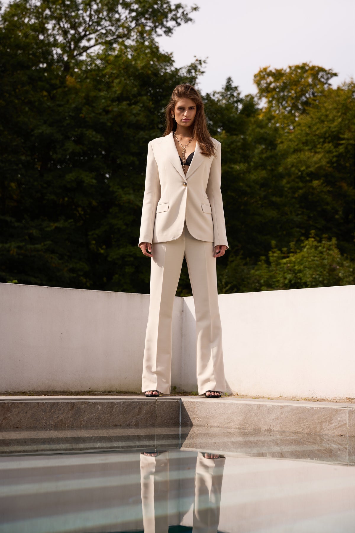 - Regular fit - Straight legs - Zip and button closure - Elegant drape