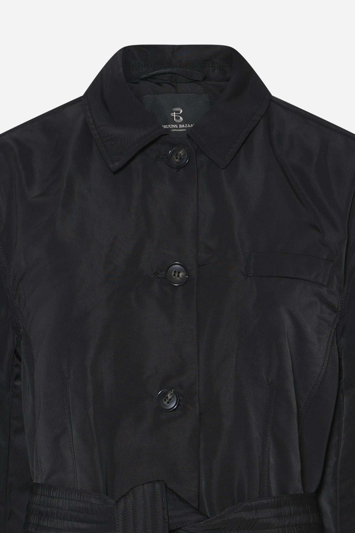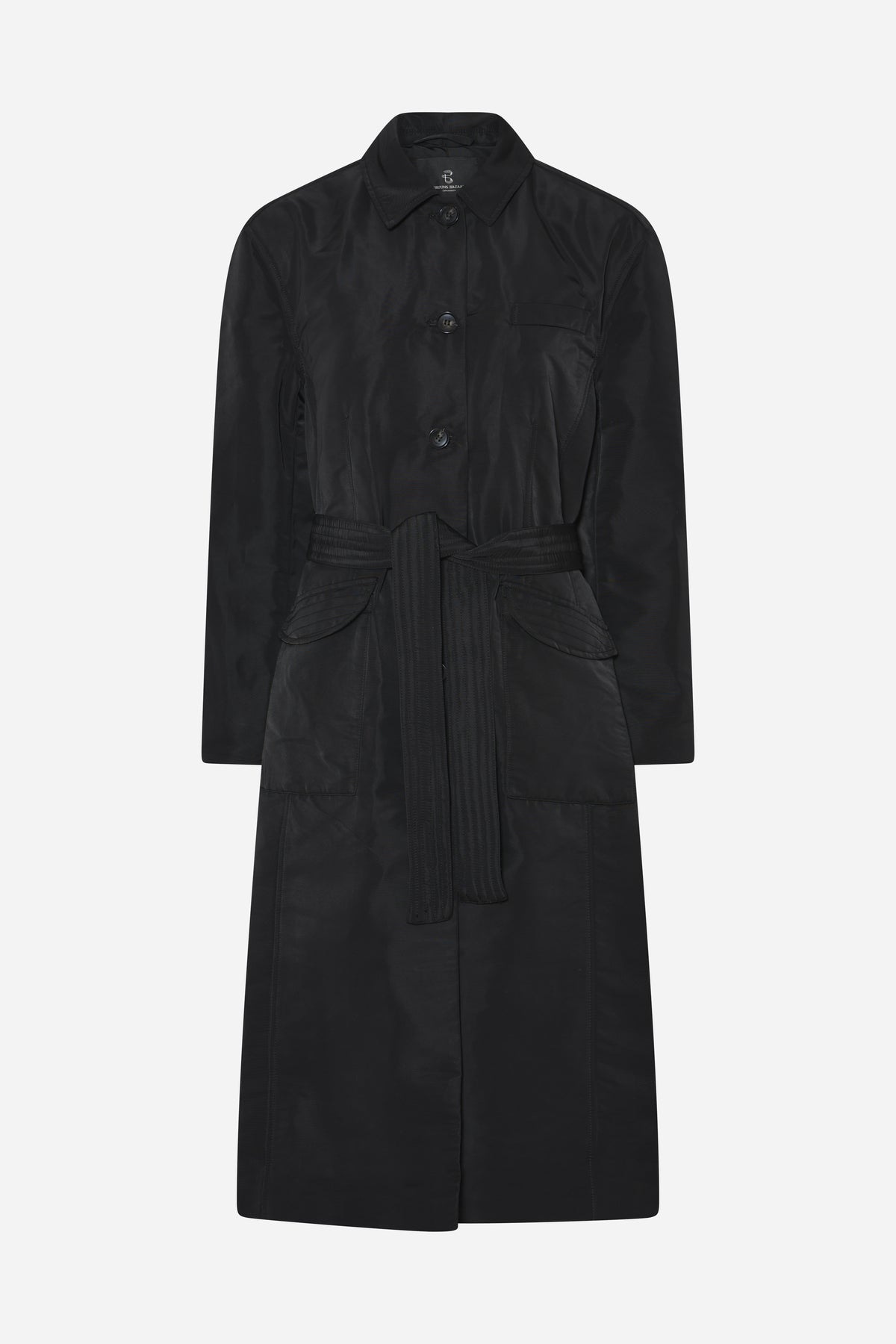 ReginaeBBFloreli is a long, black jacket with button closure and a tie belt at the waist. The design has a matte finish and large pockets that combine function and elegance.