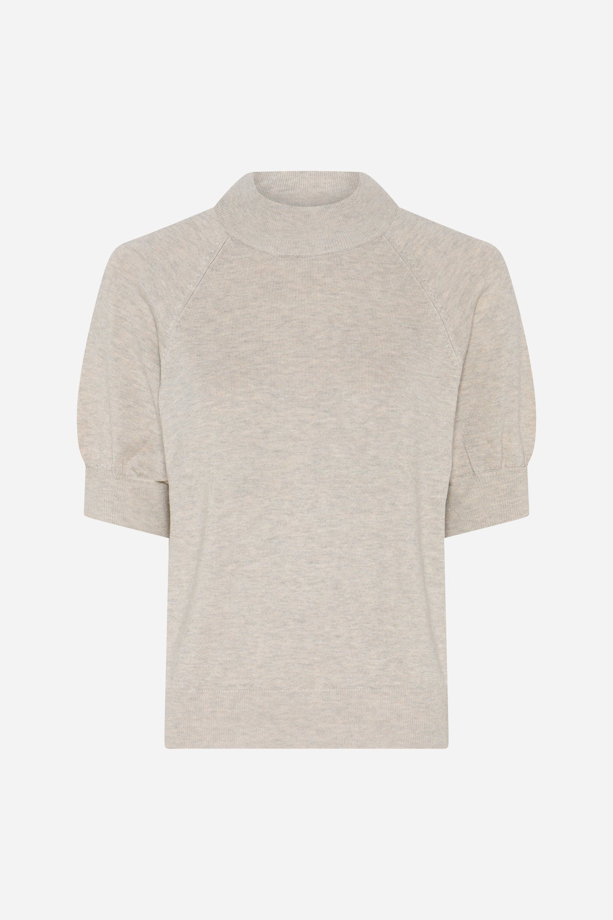 AnemoneBBHalias knit is a blouse with short puff sleeves, rib details, and a high round neck. It has a feminine silhouette with a classic and versatile look.