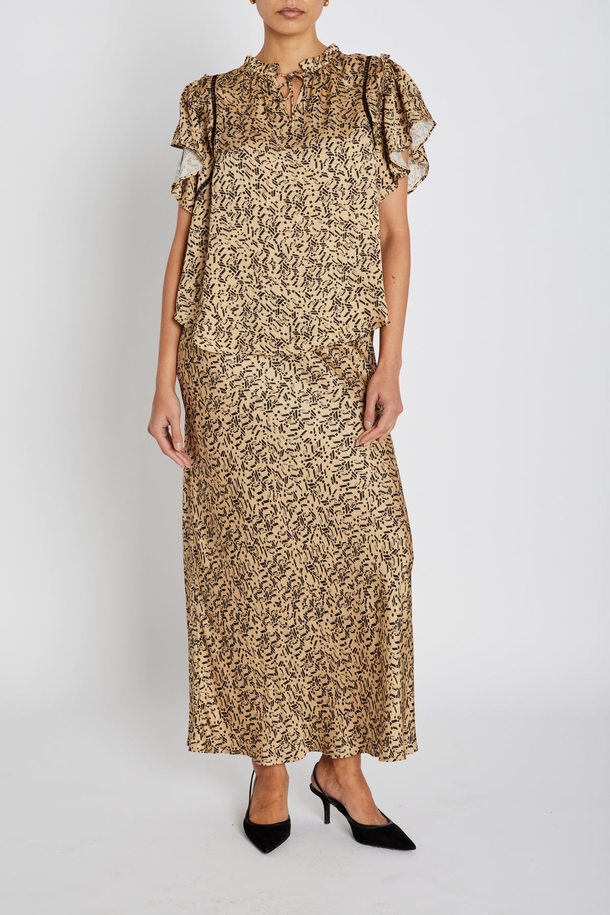 AcaraBBSabrine blouse is a feminine blouse with a light and airy expression. The design features ruffle details at the shoulders and a decorative print that adds character without feeling heavy.