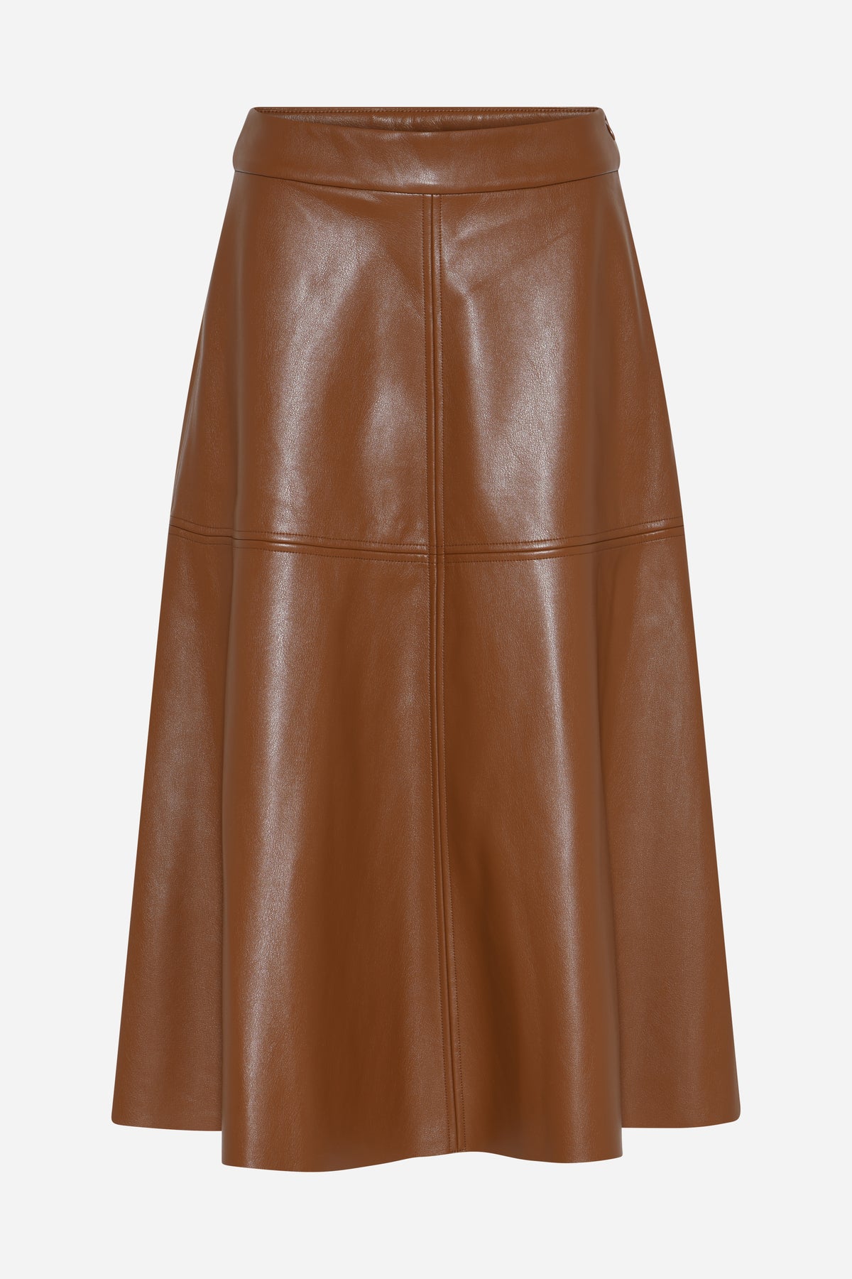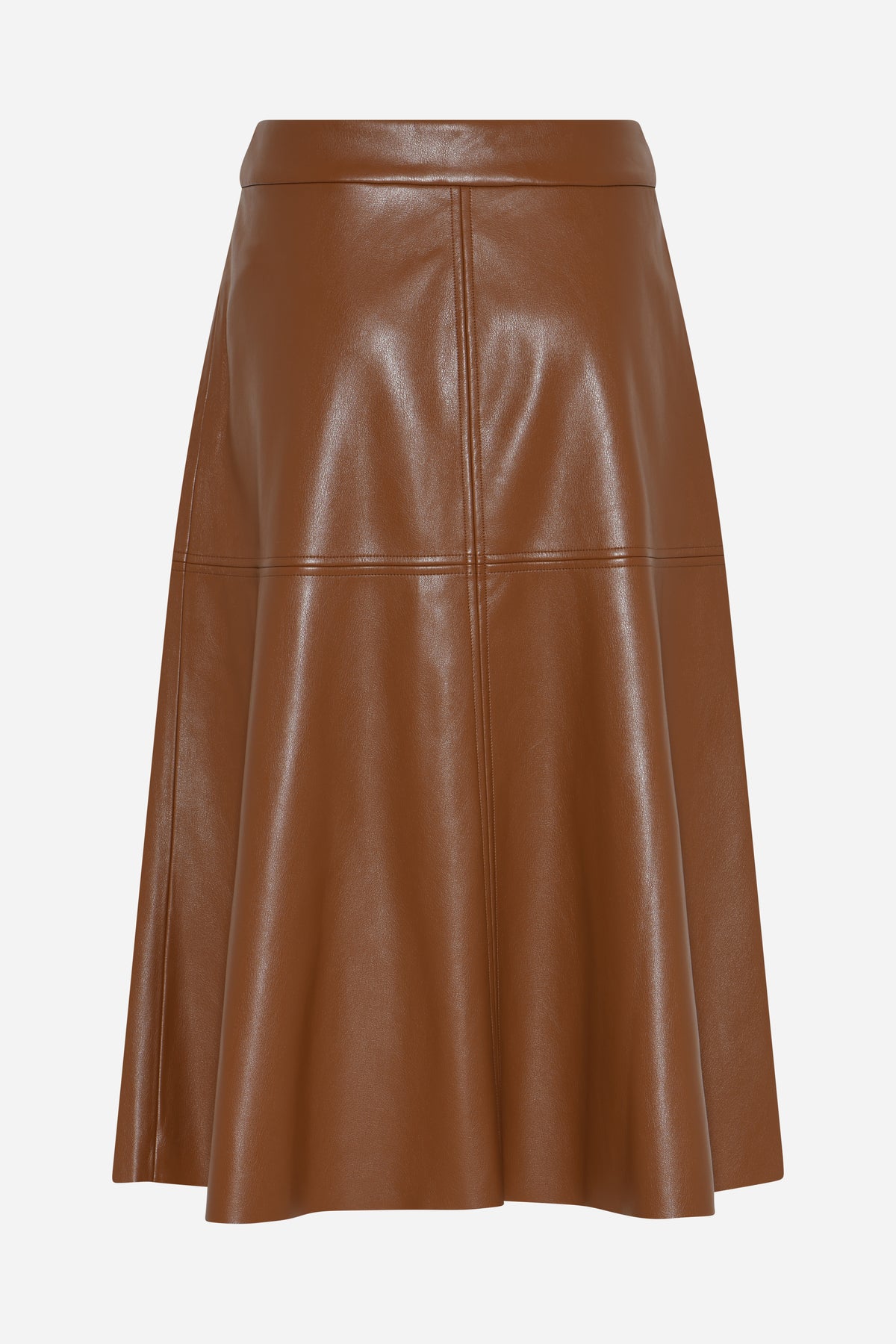 The VeganiBBImma skirt is a mid-length A-line skirt in soft vegan leather with a high waist and clean lines. Perfect for elegant and modern everyday looks.