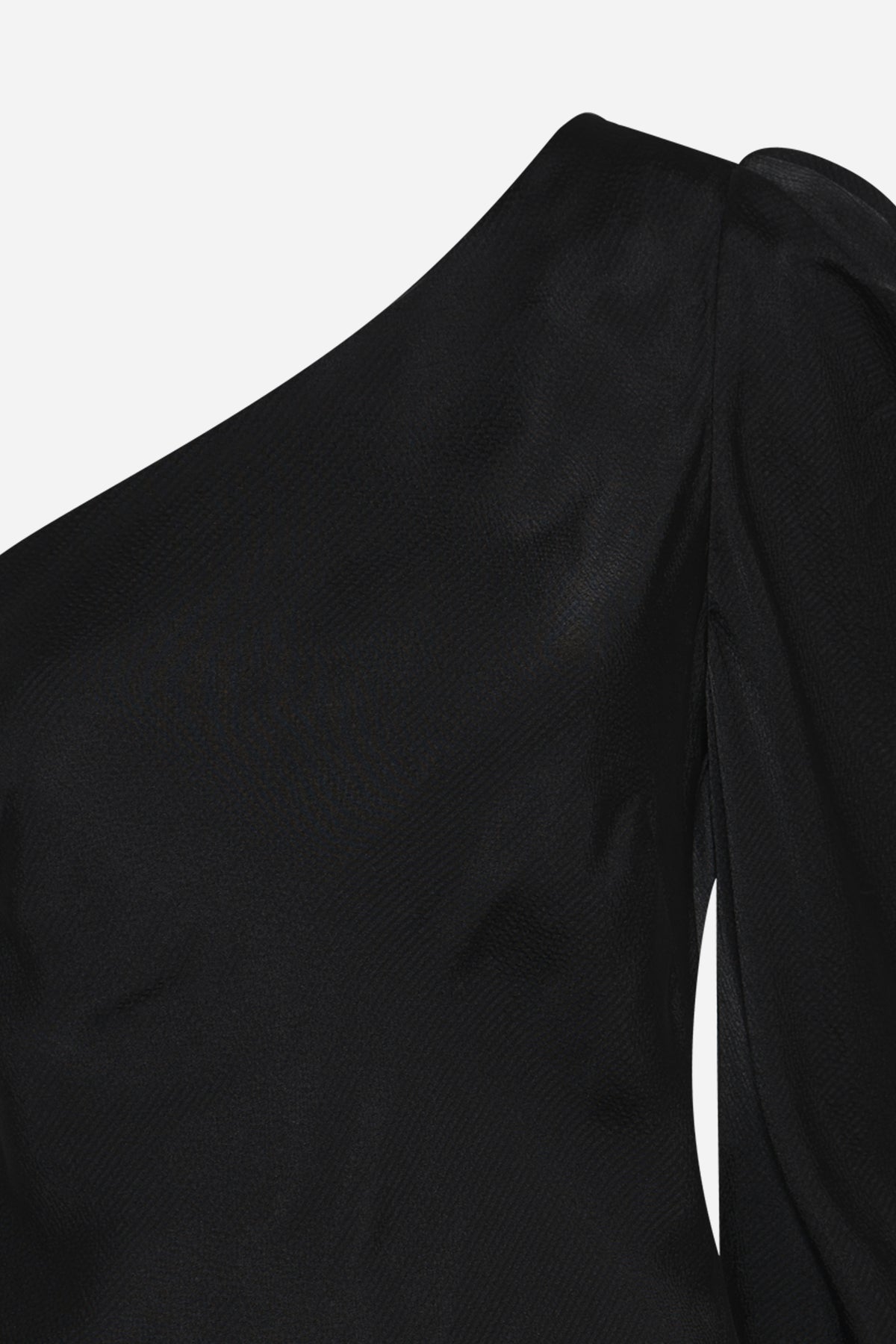 ArfajBBAmisa dress is an elegant one-shoulder piece with a single long puff sleeve and an asymmetric hemline. The design creates a modern and sophisticated look.