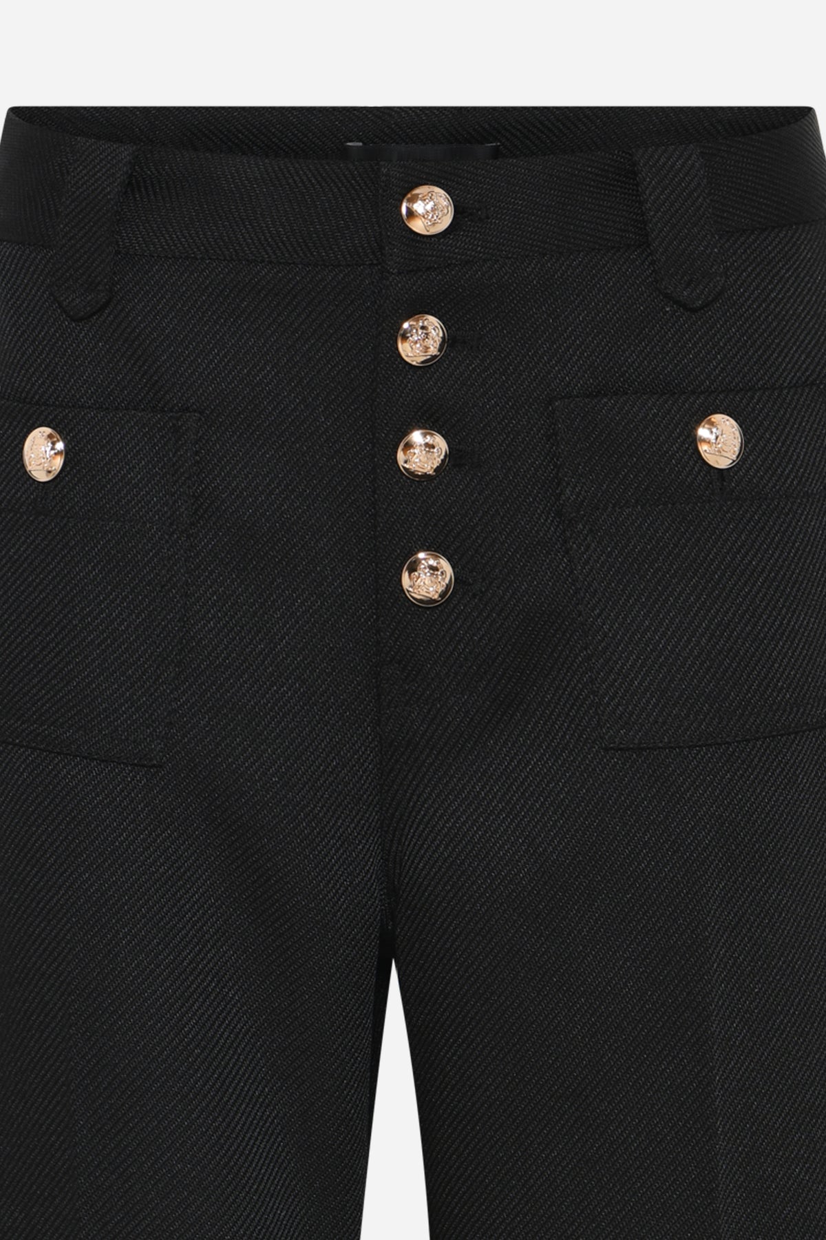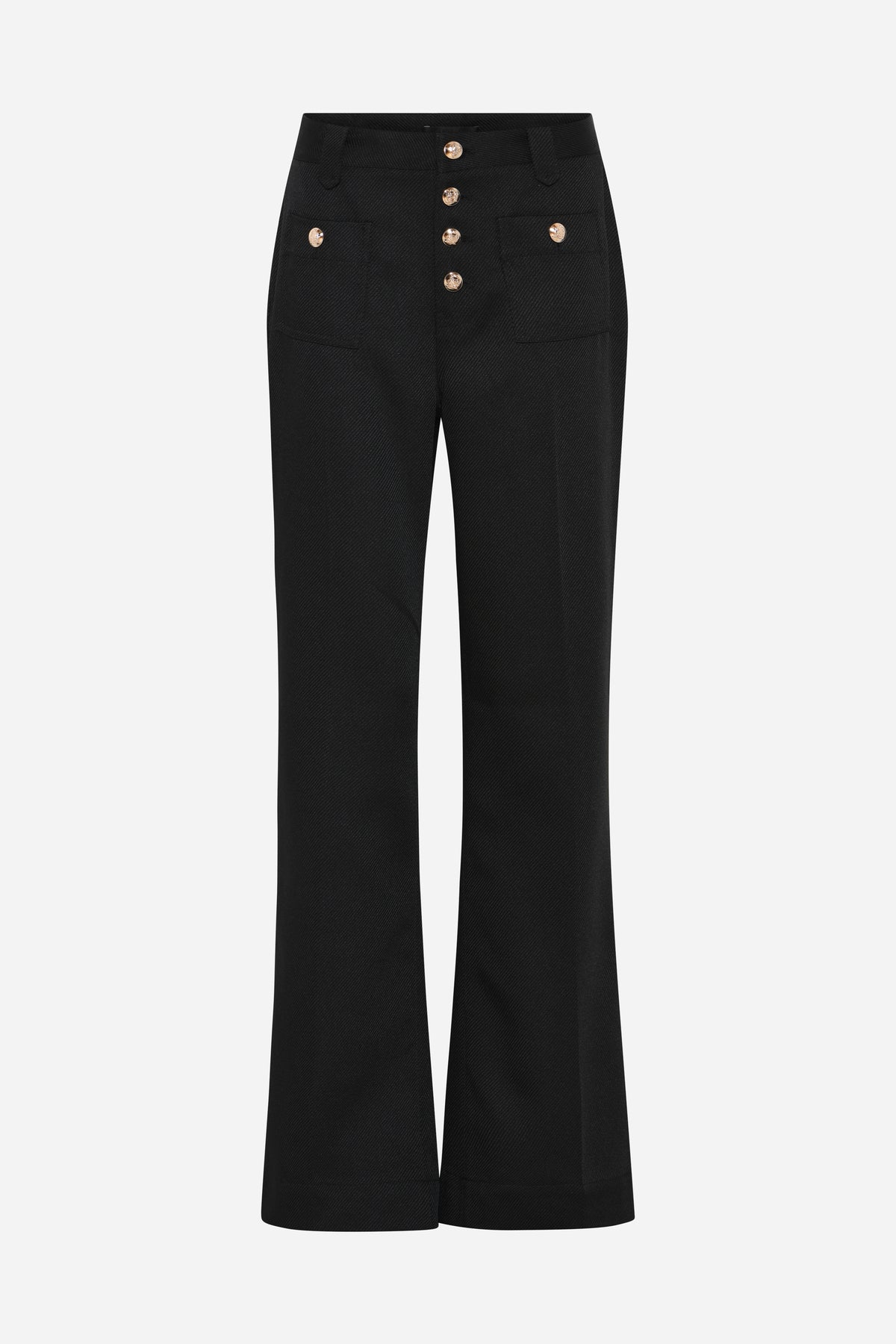 - High waist - Slightly flared legs - Decorative front pockets with buttons - Timeless design in structured fabric