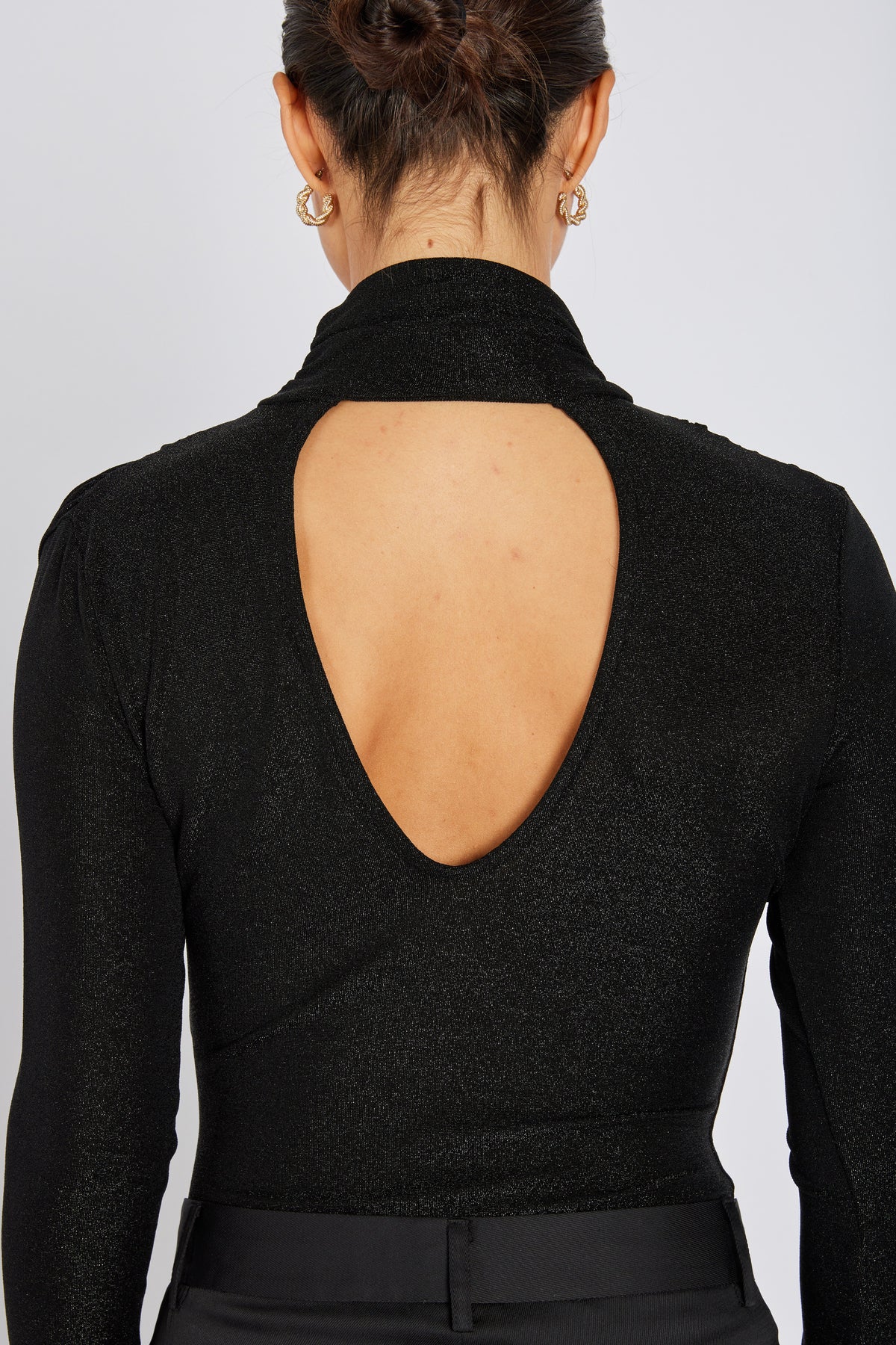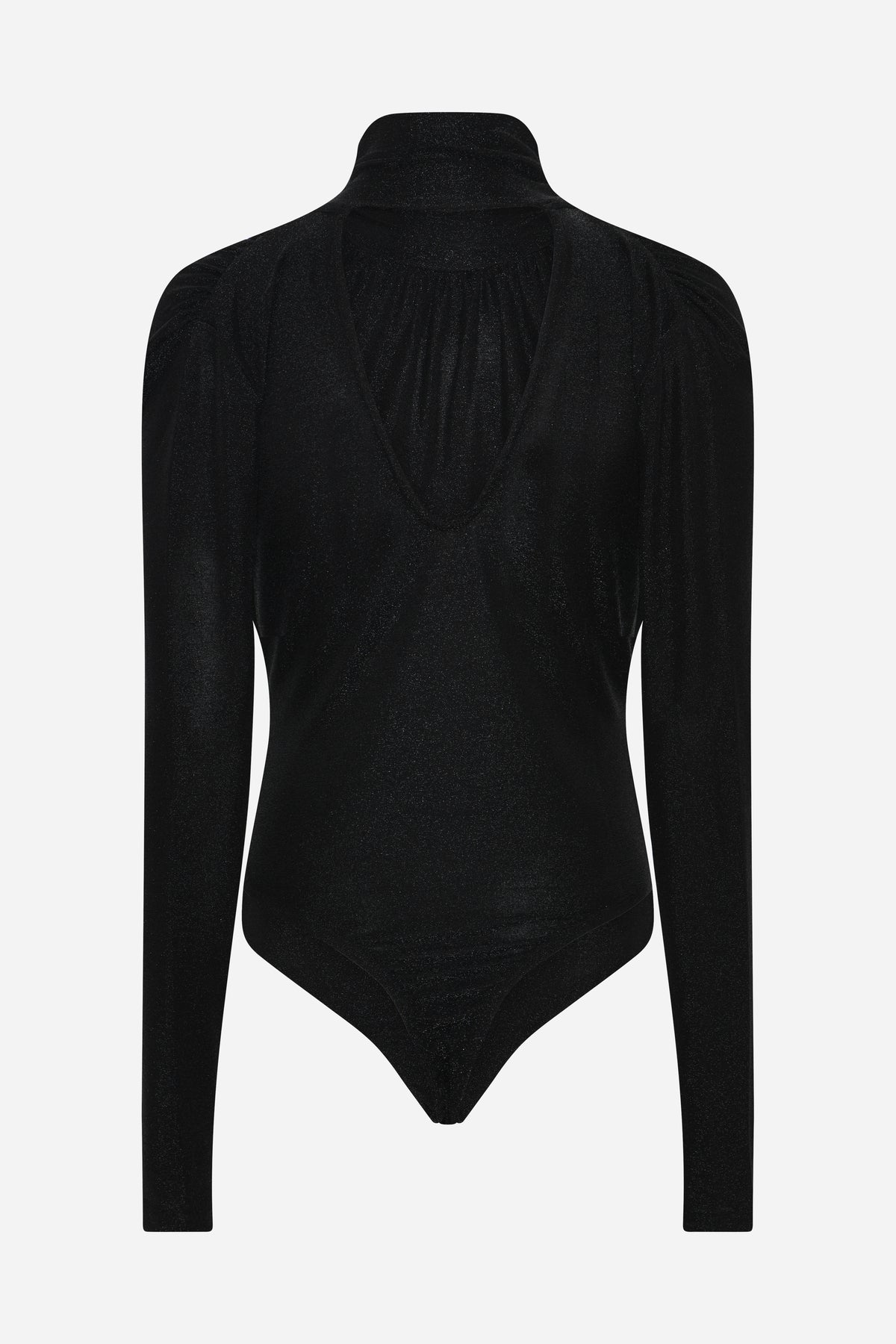 ComfreyBBZarina body is an elegant and sophisticated piece featuring a high neckline, long sleeves, and a flattering open-back design in subtly shimmering fabric.