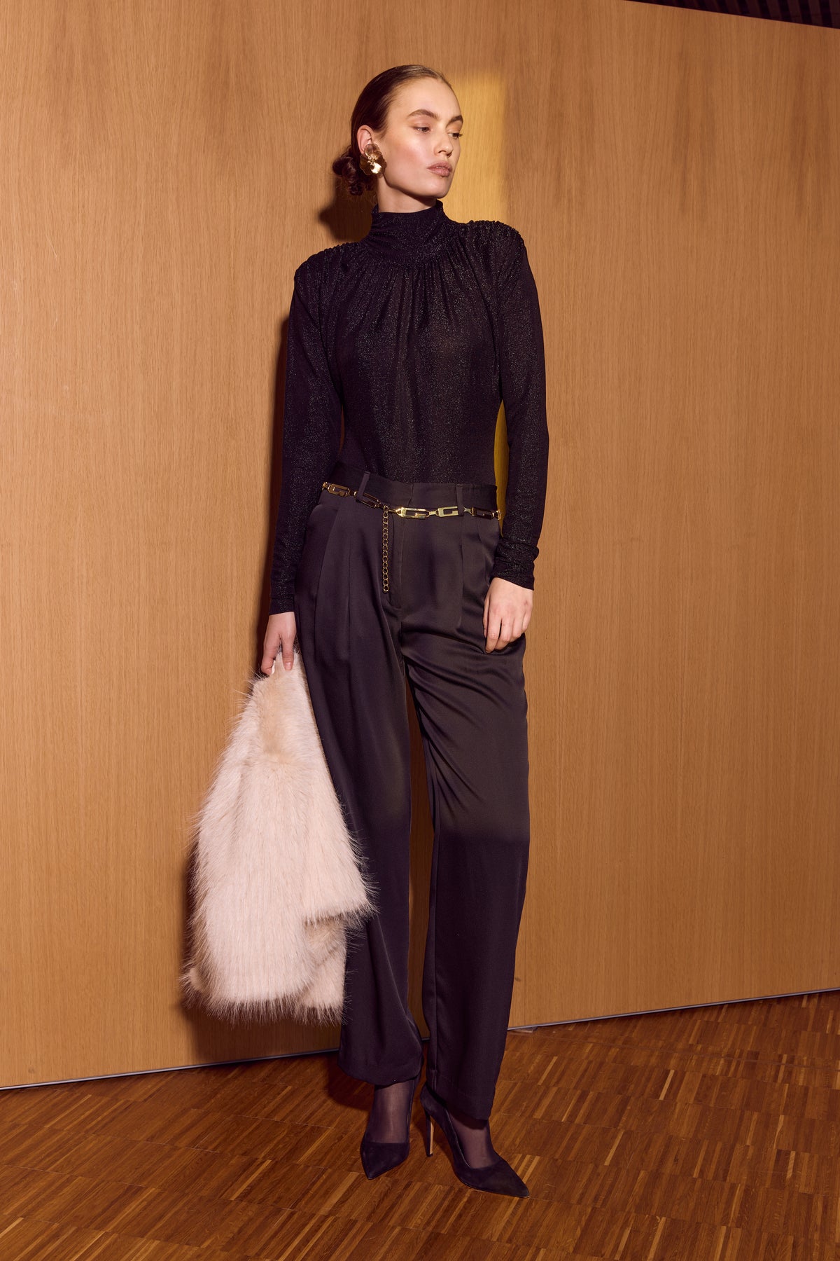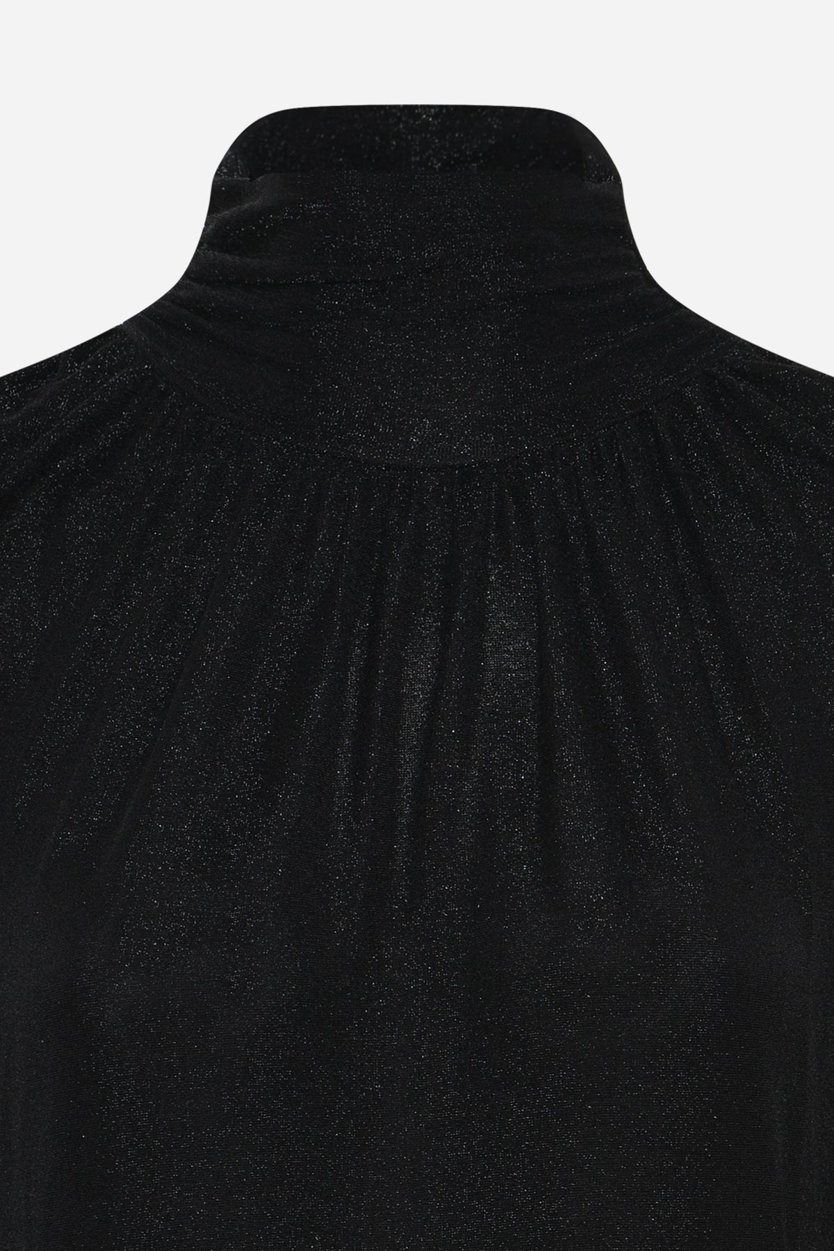 - High neckline with draped details