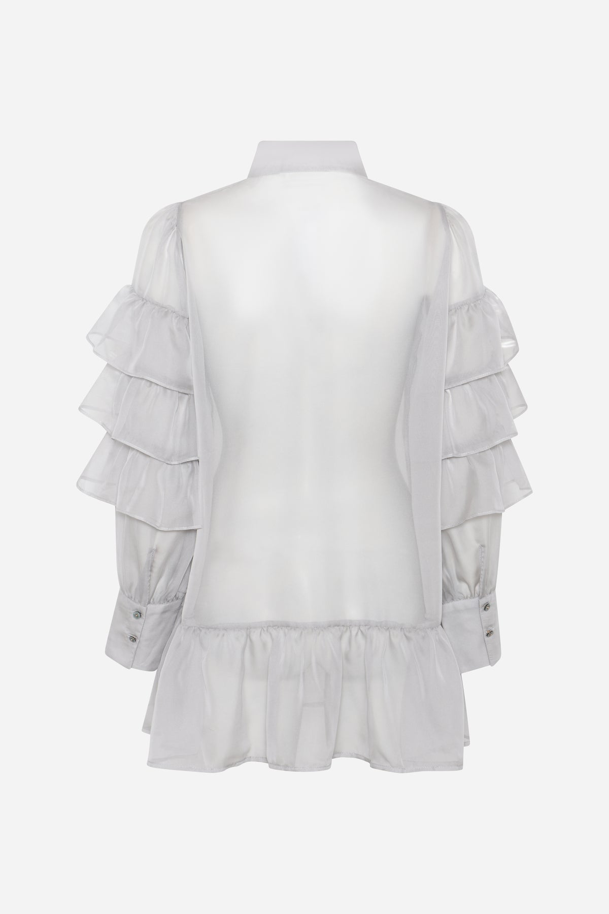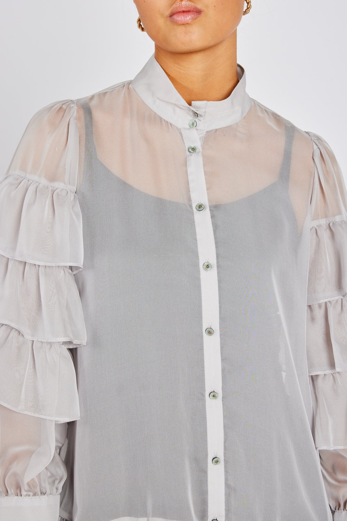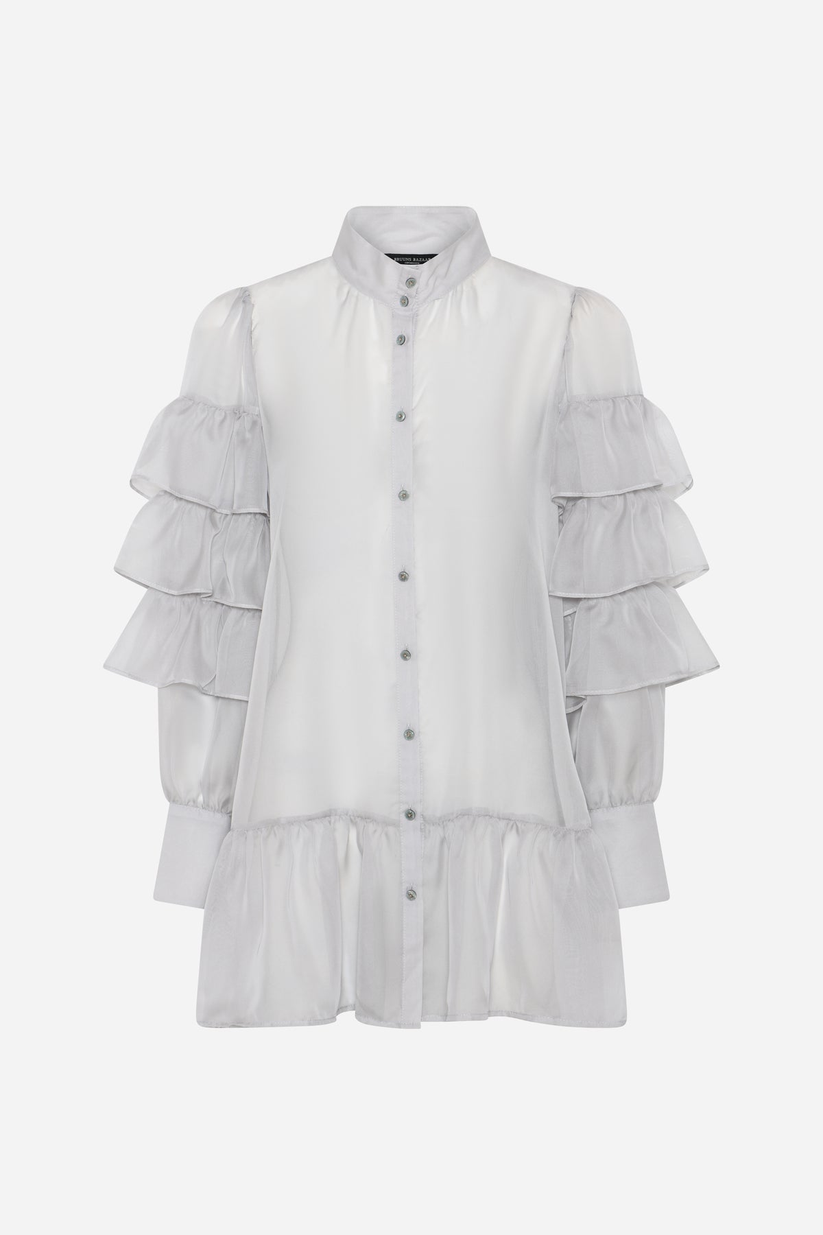 CoakumBBViri long shirt is a lightweight sheer shirt in light grey, featuring a stand-up collar, button closure, and voluminous ruffle details on sleeves and hem. A feminine statement with a modern edge.
