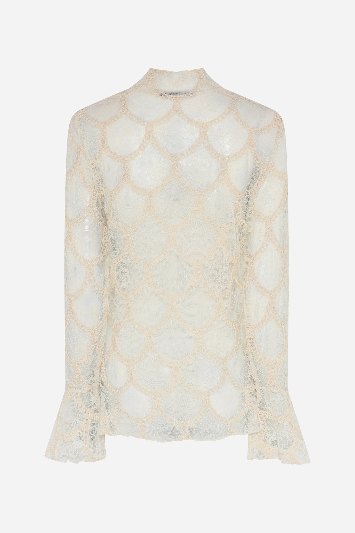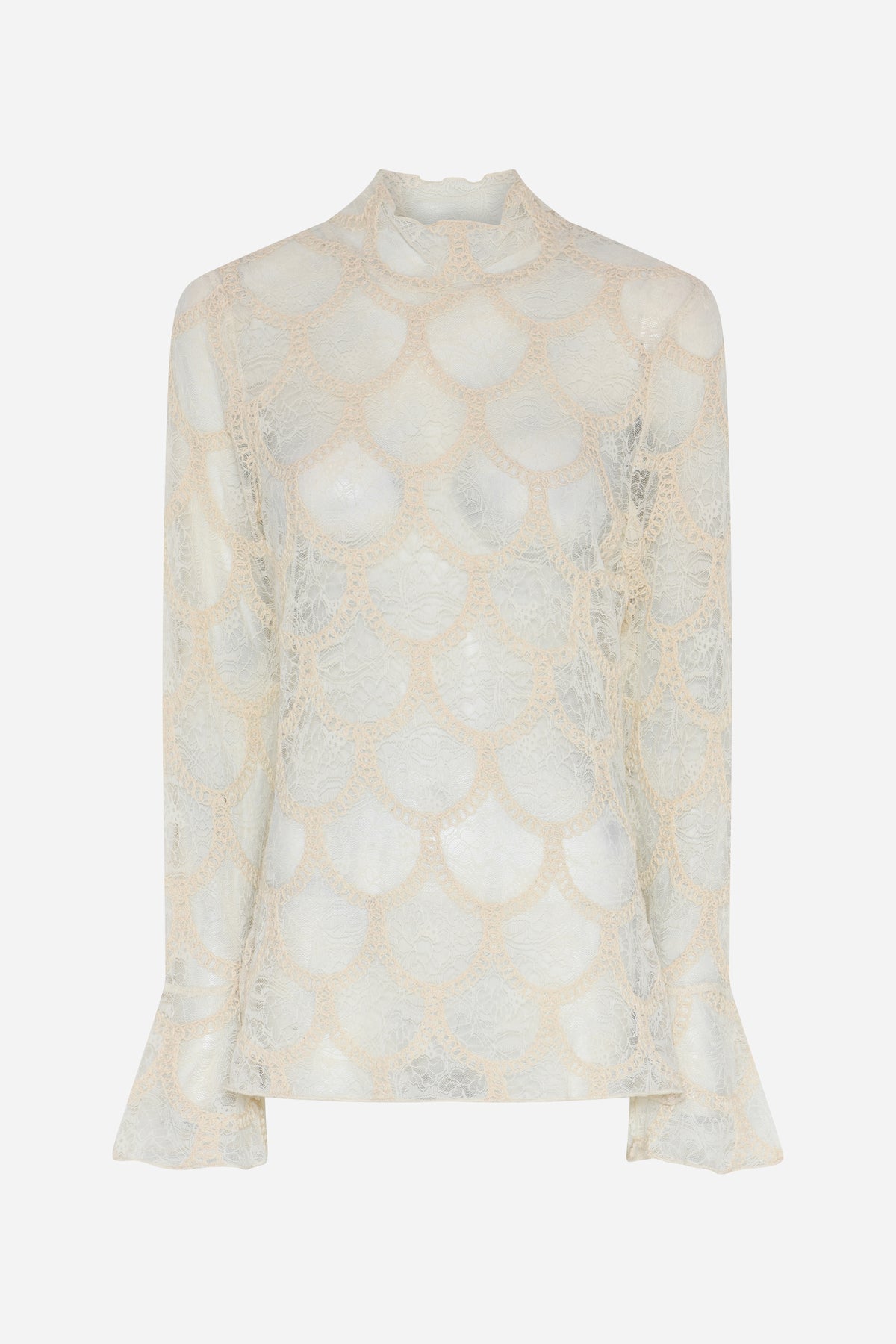 DeodaraBBSuzi blouse is an elegant lace style with a regular fit, high neckline and flared sleeves. Designed in a sheer structure with a feminine pattern.