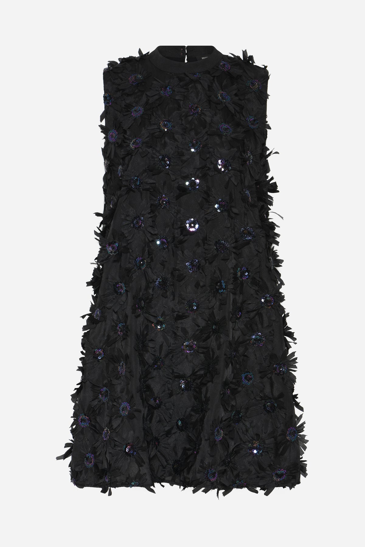 The SculusBBChi dress is a sleeveless mini dress featuring three-dimensional floral appliqués and shimmering sequins. A statement piece combining texture, shine, and a modern aesthetic.